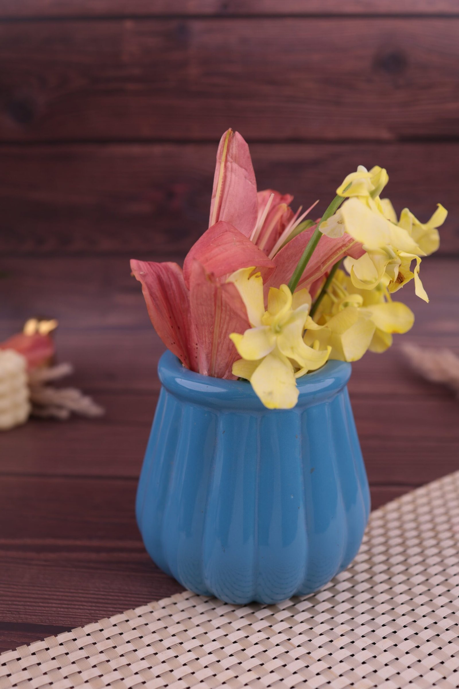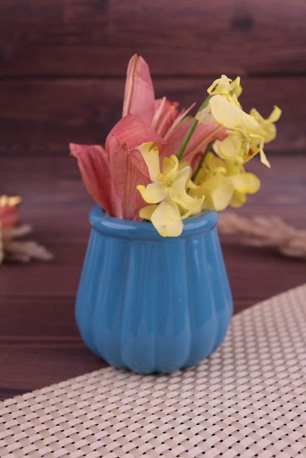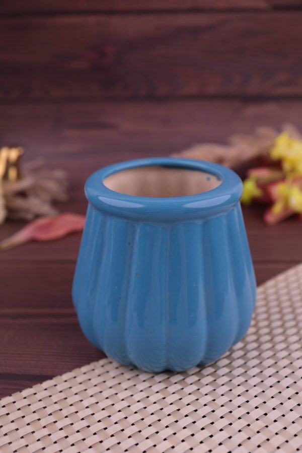 Its distinctive shape is reminiscent of a petite, plump pumpkin featuring vertical fluting that adds texture and depth to the design.